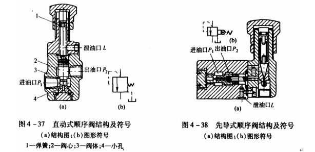 (2)先導式順序閥。圖4-38表示先導式順序閥結構及符號。它的結構與先導式溢流閥的結構基本相同。但先導式順序閥來用單獨的泄油口L。它的工作原理是當進油油口(團中未標)通入壓力油,其液壓力超過彈簧力,使進出油口相通,操縱另一級執(zhí)行元件動作。