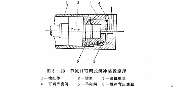 圖3-22是活塞頭部帶有軸向三角節(jié)流溝梢的緩沖裝置。當(dāng)活塞運(yùn)動到接近終點(diǎn)時(shí)將回油路封閉,油缸中剩下的油液只能通過三角狗槽流出,形成液壓阻力;钊酵耙疲枇υ酱,直至移動部件停止運(yùn)動。也有在油缸端部加可調(diào)節(jié)流間,使油缸中被封閉的油液經(jīng)可調(diào)節(jié)流閥口流出,這樣便可按負(fù)載慣性力大小適當(dāng)調(diào)節(jié)緩沖背壓,其工作原理示于圖3-23。